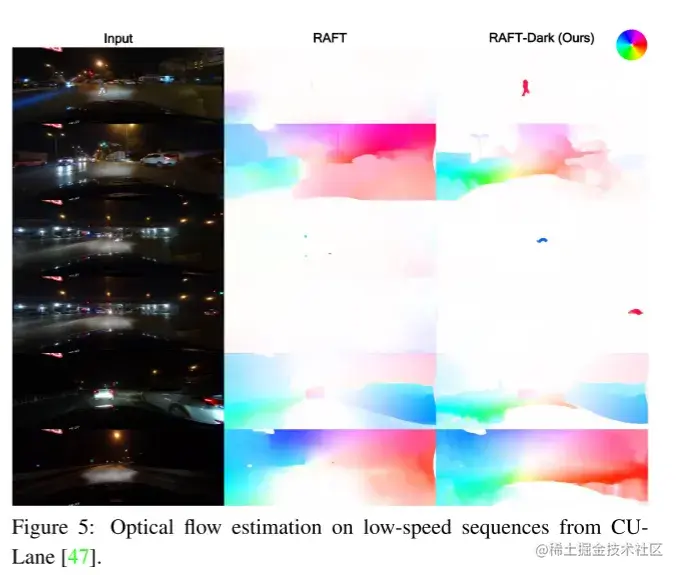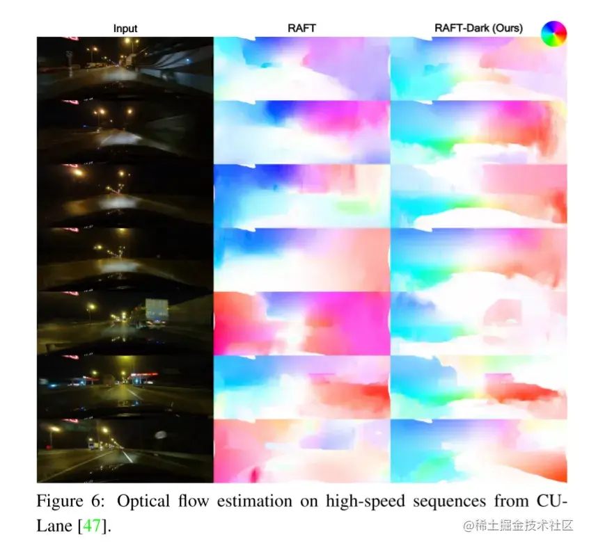 由于缺乏具有光流ground truth的夜间数据,本文只能对本文的方法进行定性评价,简称RAFT-Dark。本文使用CULane[47],这是一个大型汽车数据集,包含了许多具有挑战性的现实世界弱光序列。在图5中,本文展示了在一些低速序列上vanilla RAFT和RAFT-Dark之间的比较。RAFT-Dark显示出优于RAFT的性能。在第一排、第三排和第四排,RAFT-Dark能够检测与行人和车辆相关的运动,这些运动要么经历了一些剧烈的光照变化,要么看起来太暗和嘈杂。在其他情况下,请注意RAFT-Dark如何在地平面(ground plane)以及与ego vehicle运动一致的方向和幅度上给出明显更好的估计。为了方便起见,在右上角附加了一个彩色编码轮,用于可视化每个像素的光流矢量:颜色表示流矢量的方向,而强度表示位移的长度。由于ego vehicle总是向前行驶,所以前摄图像中的ground truth 光流矢量应该直观地指向图像边界,远离图像中心。并且由于运动视差,人们应该期望朝向图像边界的流矢量有较大的幅度,而图像中心周围的流矢量有较小的幅度。换句话说,虽然本文无法获得数字ground truth流,但本文知道颜色编码的ground truth应该表现出与色轮相同的模式:图像的左侧为蓝色或绿色(bluish or greenish),而右侧为红色或黄色(reddish or yellowish)。考虑到这一点,RAFT无法估计与车辆运动一致的正确光流,尤其是在背景区域,如地面。另一方面,RAFT-Dark不仅在这些区域表现出色,而且在某些情况下还学会了分离黑暗的天空,并捕捉细节,如第二排的路灯。图6中CULane的高速序列进一步说明了这种改进。