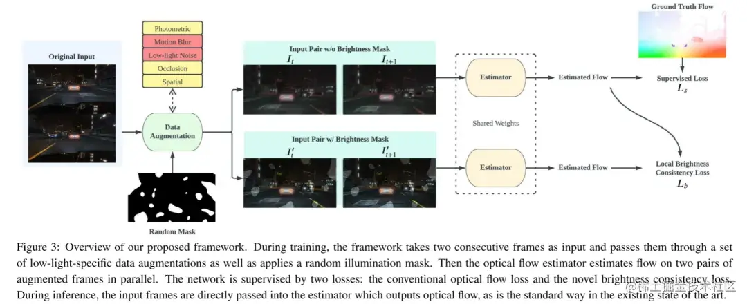 图3:本文提出的框架概述。在训练过程中,该框架以两个连续的帧作为输入,通过一组弱光特定的数据增强,并应用随机光照mask。然后光流估计器并行估计两对增强(augmented)帧上的流。该网络受到两种损失的监督:传统的光流损失和新的亮度一致性损失。在推理过程中,输入帧被直接传递到输出光流的估计器中,这是现有技术中的标准方式。