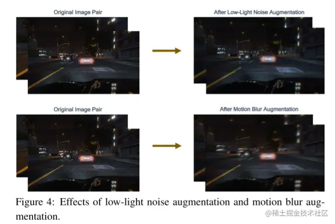 图4:弱光噪声增强和运动模糊增强的效果。