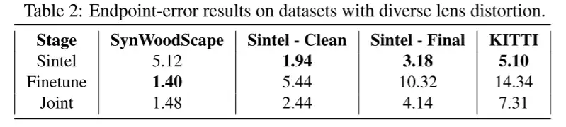 然后本文在表2中显示定量结果。本文使用端点误差(EPE)作为度量,它是光流估计的标准误差度量。它估计流矢量和ground truth之间的欧几里得距离,并在所有像素上平均。本文对上面描述的两个基线(阶段“Finetune”和”Joint”)以及作者(the author)在SynWoodScape、Sintel(clean and final passes)和KITTI的四个 hold-out 测试集上提供的预训练模型(阶段“sintel”)进行评估。SynWoodScape是唯一一个强畸变输入的测试集,而其他三个是假设畸变非常小的针孔相机模型。尽管预训练的模型在针孔摄像机上表现出色,但在鱼眼输入上性能显著下降。本文的第一个基线,在鱼眼图像上的一个微调(finetuned),在SynWoodScape上给出了最好的结果,但在其他方面的性能非常差。这与本文的期望是一致的,因为在没有考虑泛化的情况下,对针孔(pinhole)相机和鱼眼相机的预训练和微调(finetuned)模型分别进行了最佳训练。另一方面,本文的第二个基线,联合训练的模型,保持第二好(keeps the second best),同时非常接近所有四个数据集的最佳得分。因此,联合训练提供了一个直截了当但很强的基线,在具有明显畸变的镜头上的泛化很好(generalizes well)。