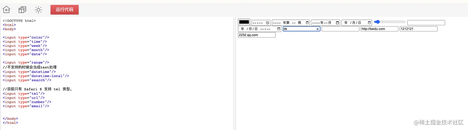 - 新增表单类型:date、email、number、color、tel、range等