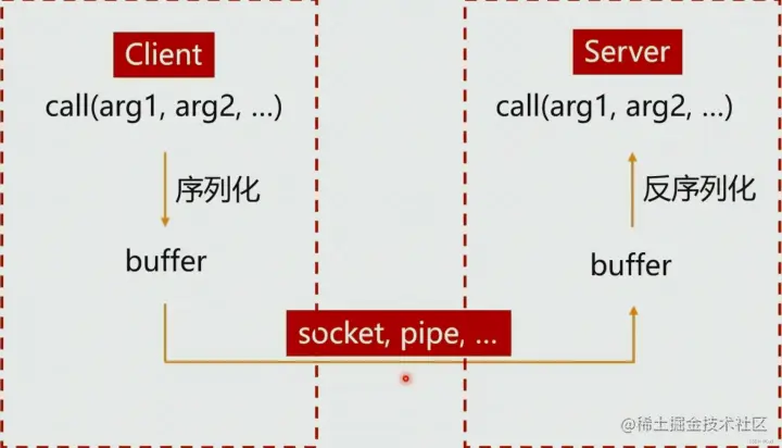 如果使用 Linux 提供的夸进程通信方式来看,流程如上图,Client 端通过函数传参序列化成 buffer,然后通过 Linux提供的如 Socket ,管道,等通信方式进行传输,然后到 Server端进行解析。