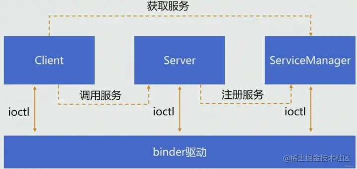 上图是展示的系统服务的 binder 通信,因为只有系统服务才能注册到 ServiceManager 中,应用的服务是无法注册到 ServiceManager 中的,通过不了权限验证。Client 是应用进程,Server 是系统服务(可能跑在 SystemServer 进程,也可能是单独进程)ServiceManager是一个单独的进程。无论是 Client 还是 Server 还是 ServiceManager,第一步都是需要先启动 binder 机制。