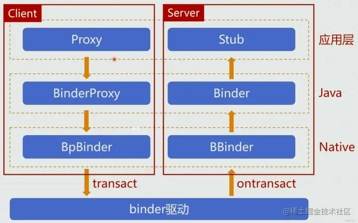 - Binder 并不是 Linux 提供的跨进程机制,它是跑在驱动层的跨进程方式,它是数据内核太,并没有使用 Linux 的跨进程通信方式(socket,pipe,共享内存…)
