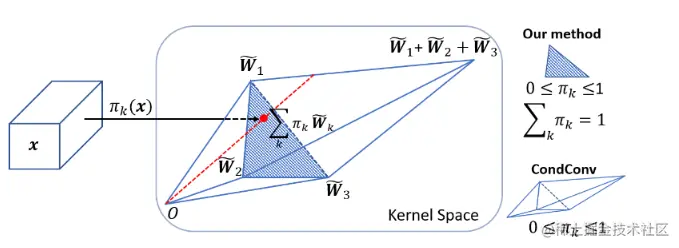 在常规卷积中,卷积核参数一旦经过训练确定以后,无论输入什么样本进行测试,都会利用固定的参数取提取特征。而CondConv中,卷积核参数可以针对输入样本进行动态变换。其次,常规卷积的容量提升依赖于卷积核尺寸和通道数的增加。而CondConv中只需要在执行卷积计算之前通过多个expert对输入样本计算加权卷积核即可。CondConv本质上等价于多个静态卷积的线性组合。