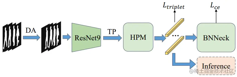 如图所示,GaitBase 采用类 ResNet 网络作为 Backbone,通过将每个输入轮廓帧转换为具有高度、宽度和通道尺寸的 3D 特征图;然后,采用时间池化模块将通过沿时间维度执行最大化来聚合获得的特征图序列,输出对输入步态序列的集合级理解,即 3D 特征图。随后,将得到的特征图水平分割成几个部分,每个部分经过池化操作展成一个特征向量并进一步使用一个单独的全连接层将它们映射到度量空间中。最后,再采用广泛使用的 BNNeck 来调整特征空间,并利用单独的三元组和交叉熵损失来监督整个训练过程。