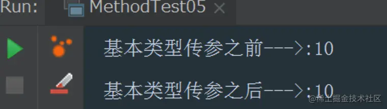 本案例执行完毕之后,我们会发现基本类型的参数传递之后,传参前后的执行结果都是10,int类型的参数没有发生改变。这个实验结果符合值传递时将实参的内容复制一份给了形参,修改形参不会对实参造成影响的特征。