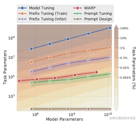 论文使用100个prefix token作为默认参数,大于以上prefix-tuning默认的10个token,不过差异在于prompt-Tunning只对输入层(Embedding)进行微调,而Prefix是对虚拟Token对应的上游layer全部进行微调。因此Prompt-Tunning的微调参数量级要更小,且不需要修改原始模型结构,这是“简化”的来源。相同的prefix长度,Prompt-Tunning(<0.01%)微调的参数量级要比Prefix-Tunning(0.1%~1%)小10倍以上,如下图所示