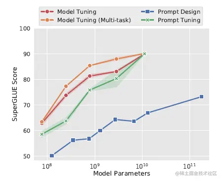 在SuperGLUE任务上,随着模型参数的上升,PromptTunning快速拉近和模型微调的效果,110亿的T5模型(上面prefix-tuning使用的是15亿的GPT2),已经可以打平在下游多任务联合微调的LM模型,并且远远的甩开了Prompt Design(GPT3 few-shot)