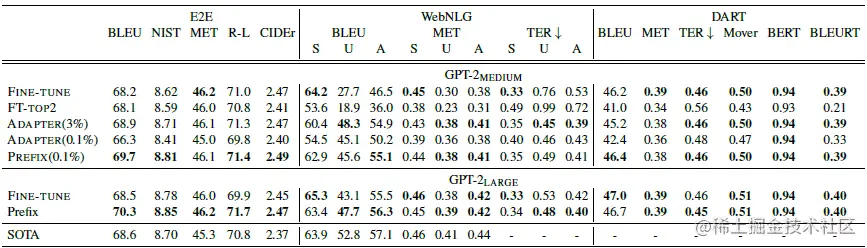 效果上在Table2Text任务上,只有0.1%参数量级的prompt tuning效果要优于微调,