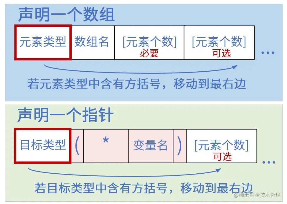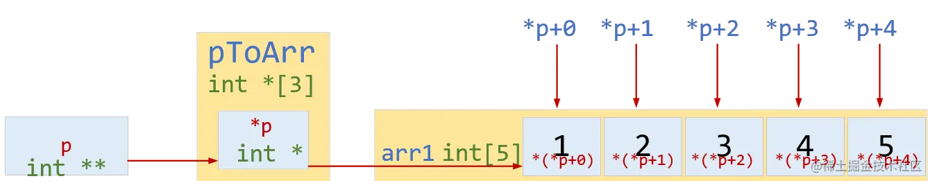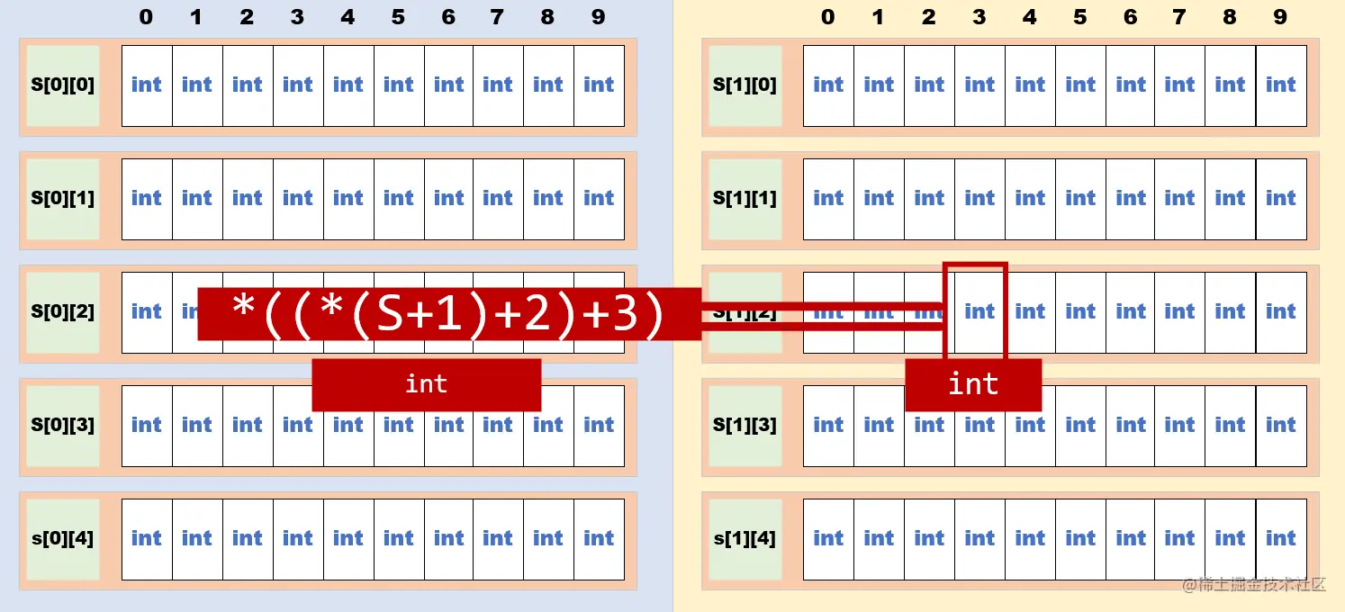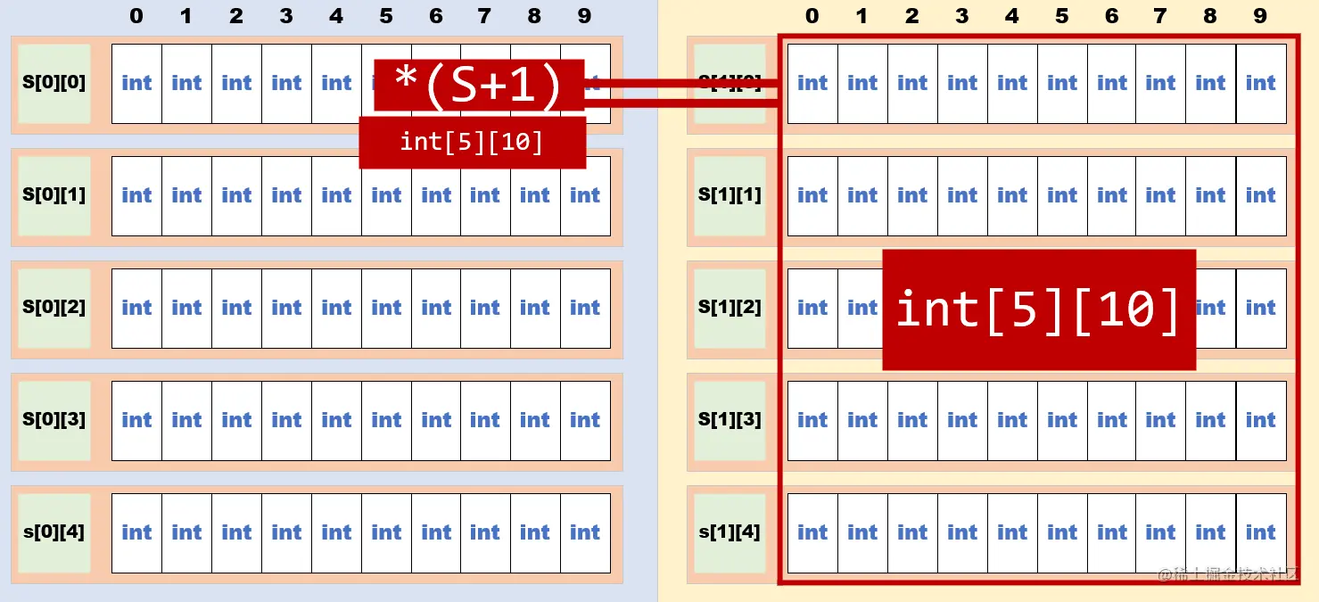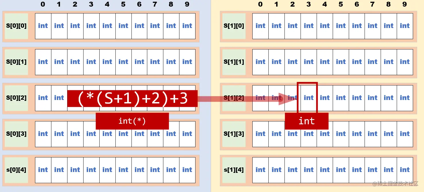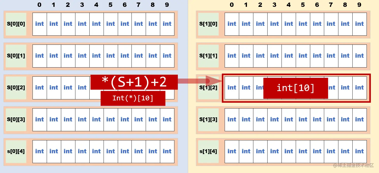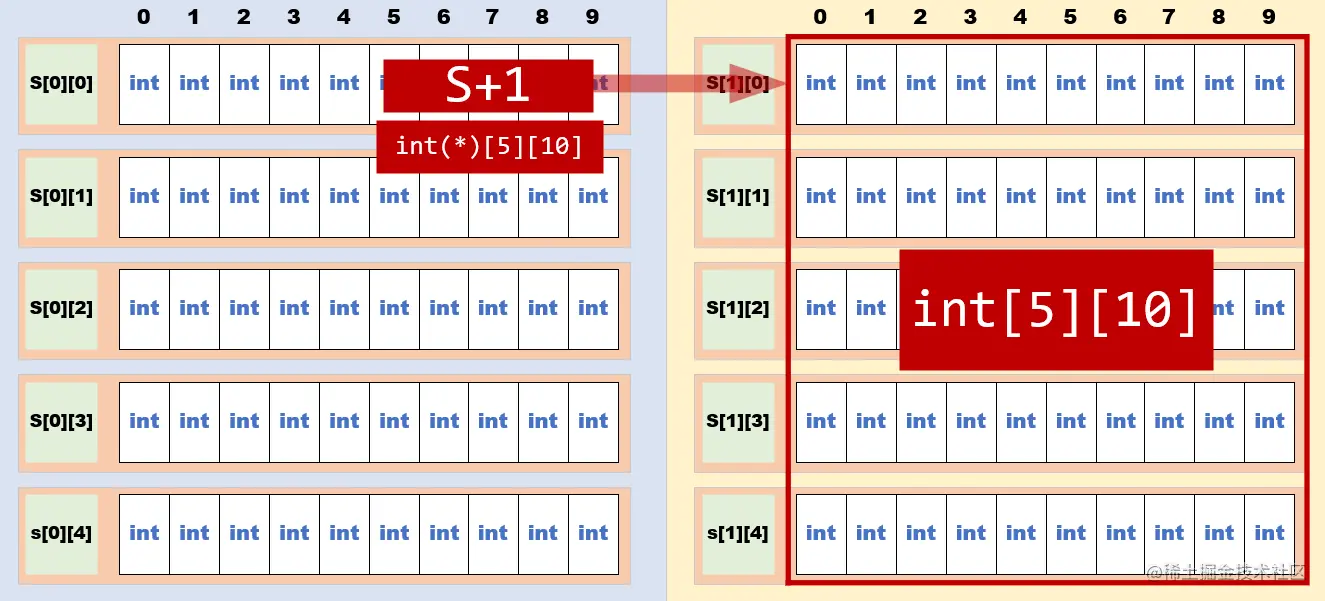 int[10]类型的数组取地址为int (*)[10]类型的数组指针,它指向int[10]的数组。 - 对