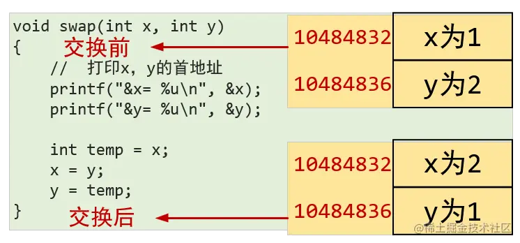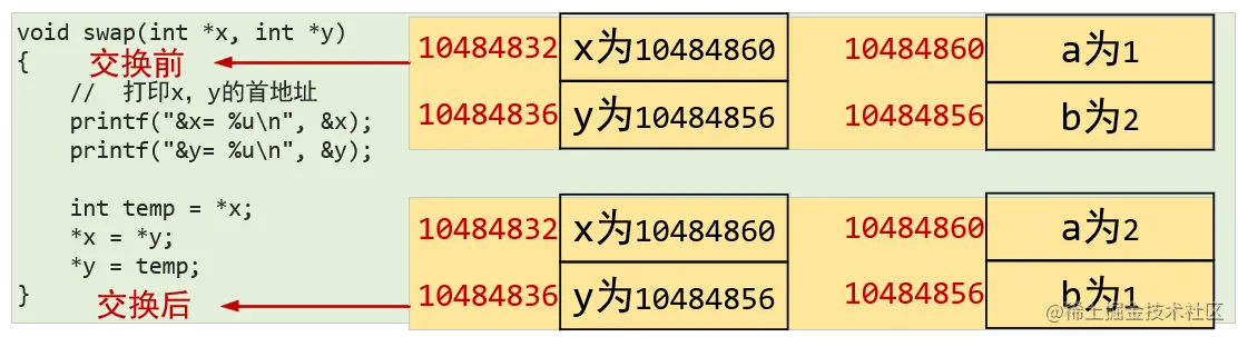 不是交换指针x,y的值,而是交换目标数据对象a,b的值。所以,需要在指针前使用取值运算符*