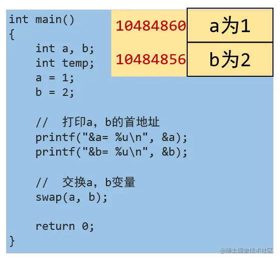 在被调函数内,为了修改主调函数中的变量,先对二级指针 a、b 取值,将 int ** 转换为 int * ,再赋