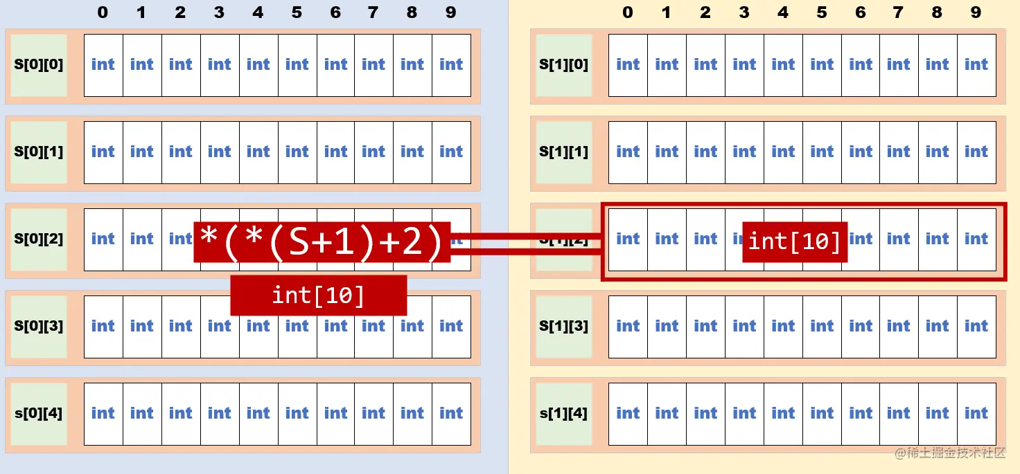 *(*(S + 1) + 2) 类型为 int[10] 的数组。