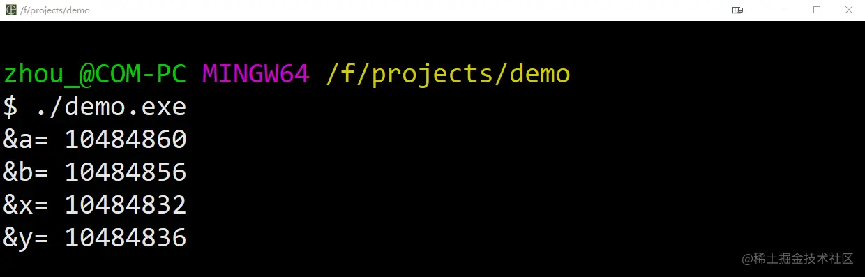 函数 func 内部, &x 、 &y 取得变量 x 、 y 的指针,类型为 int * 。