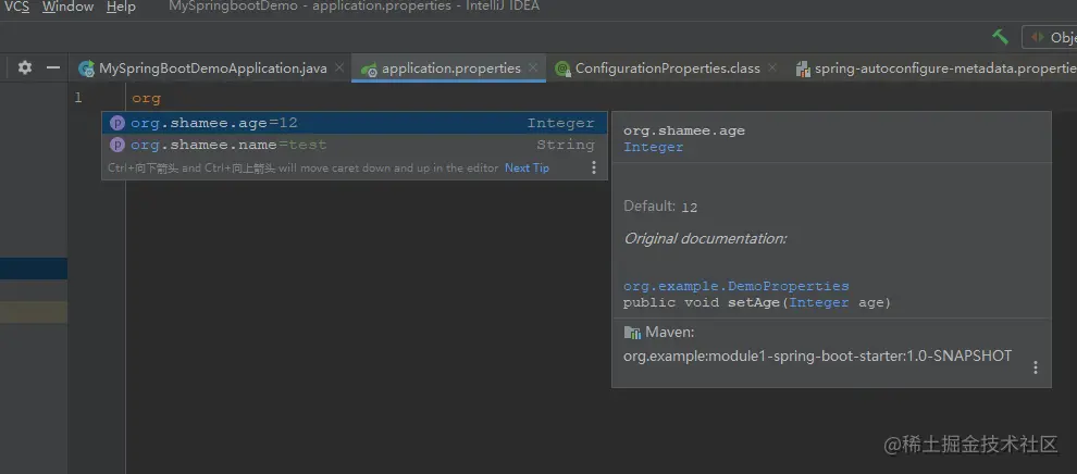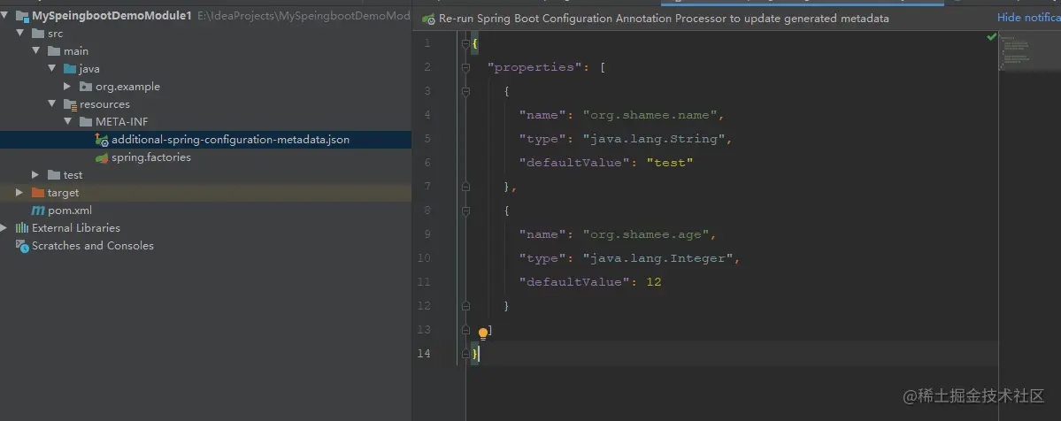 到此,一个简单的starter模块就已创建完毕,但是此时,如果直接使用,IDE是无法自动提示的。这里我们期望IDE帮我们自动提示DemoProperties中的两个属性,org.shamee.name和org.shamee.age。