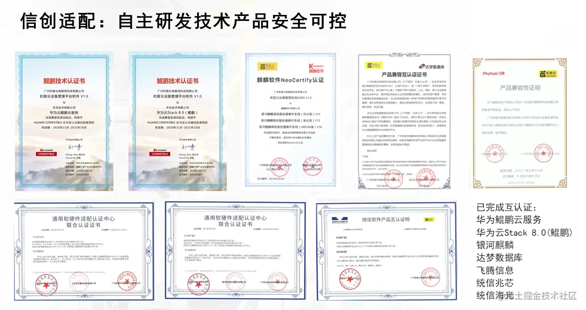 除此之外,机智云物联网多款自主研发的设备管理平台、边缘管理系统等软件、硬件产品已全面适配华为鲲鹏、银河麒麟、达梦数据库、飞腾芯片等国产软硬件操作系统,此代表着机智云的产品服务已全面适配国产化芯片、服务器、操作系统与数据库,具备高度的稳定性、兼容性及安全可靠性,也充分体现了机智云在自主研发、生产与应用的技术能力,具备将知识产权和技术能力升级迭代的能力,能够打造稳定高效、安全可控的产品服务,在物联网行业具备一定的市场竞争力。
