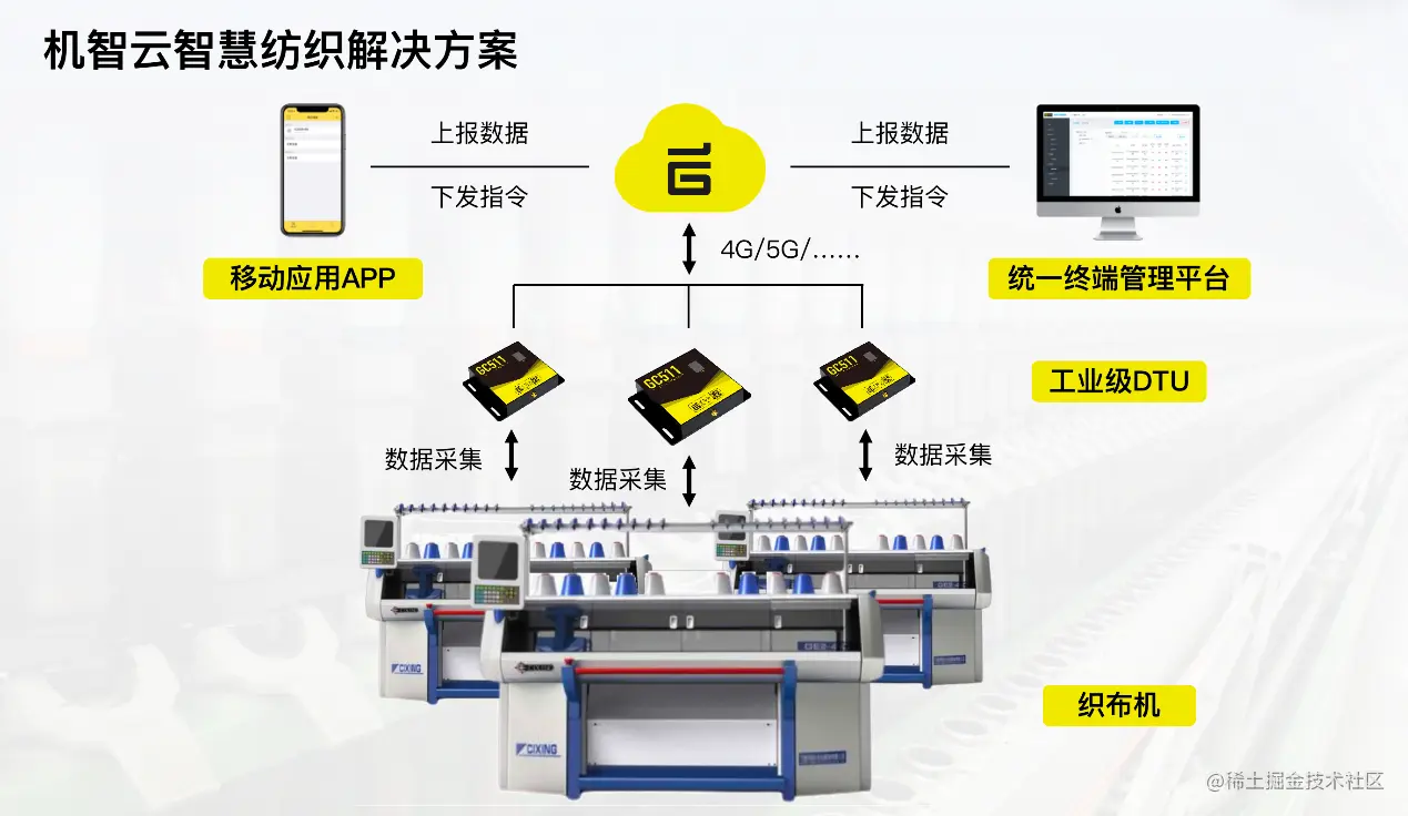 如在纺织行业领域,机智云以高性价比的 AIoT 云平台和边缘计算服务为基础,推出适配各种纺织机型的免开发工业 DTU、边缘服务器等硬件设备,形成“边云协同软件+硬件”一体化解决方案,通过低成本、高效率的方式实现纺织设备远程控制、数据采集、行为建模、状态监测、设备维护、故障诊断、风险预警、运行优化等,有力支撑纺织客户智能供应链业务运营,为纺织行业带来生产、研发、供应链管理、渠道运营等环节效率的显著提升。