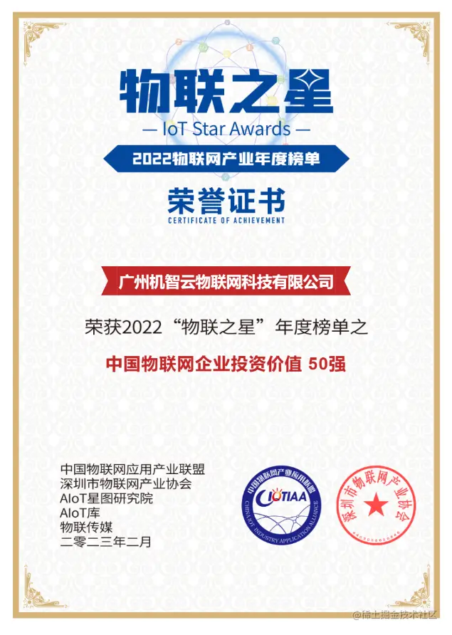近日,由深圳市物联网产业协会、深圳市物联传媒有限公司、AIoT星图研究院等联合发布的2022“物联之星”物联网行业年度榜单结果正式公布。机智云物联网凭借在物联网、大数据、人工智能等新一代信息技术上的技术创新、方案实施及市场覆盖能力,入选“2022年度中国物联网企业投资价值50强”。
