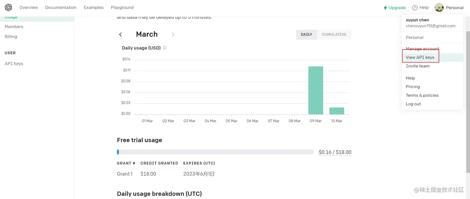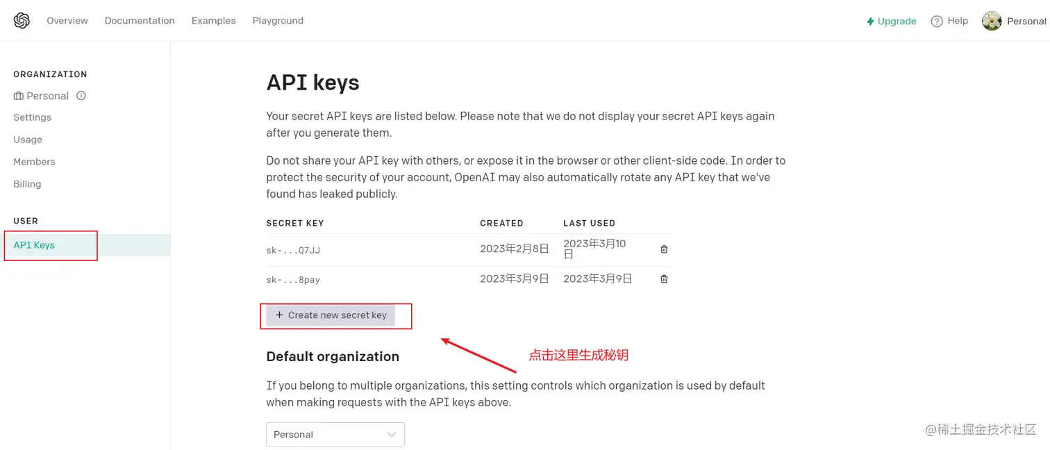 然后到openai 官网(platform.openai.com/)申请一个秘钥,每个账号都有18美元的调用额度,注册账号登录,操作步骤如下: