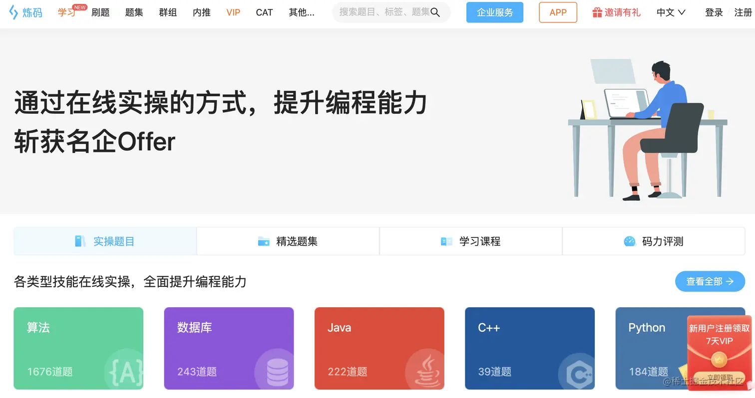是一个在线刷题的网站,涵盖算法、大数据、人工智能、面向对象编程等,汇集了各大公司的算法面试题,还有leetcode的付费题。有阶梯式训练题库,可以帮助自己选好应该刷的题目,特别适合小白和懒人。