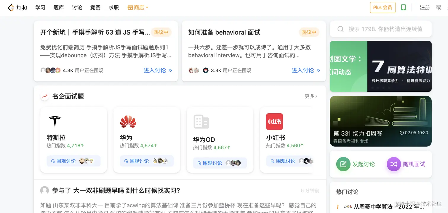 基本所有的程序员都很熟悉了,是一个在线刷题网站,可以在线编程刷题、在线判题。有很多优秀的程序员都在该网站上刷题,也会有一些面试官会从这上面挑选面试题目。
