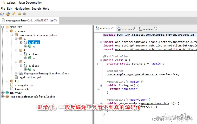 就是针对编译生成的 jar/war 包 里面的 .class 文件 逆向还原回来,可以看到你的代码写的啥。