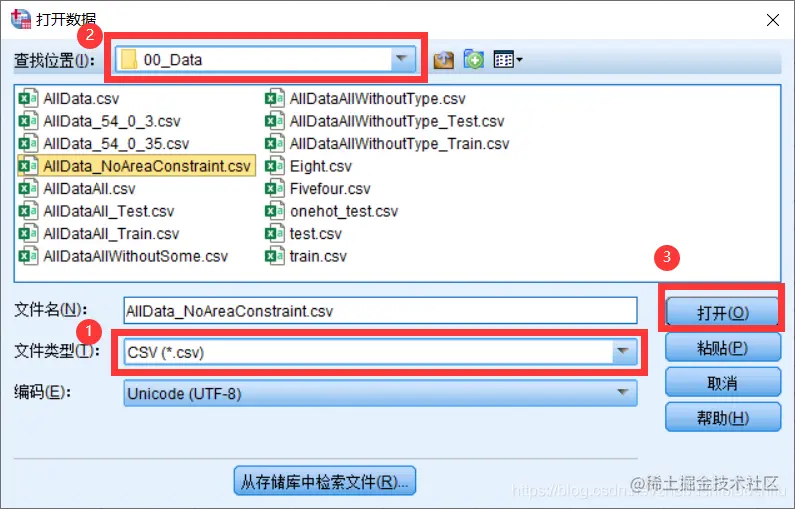 在弹出的窗口选择要导入的数据格式,随后选择数据路径与数据文件,最后点击“打开”。本文所用数据为.csv格式,因此选择文件类型为CSV(*.csv)。