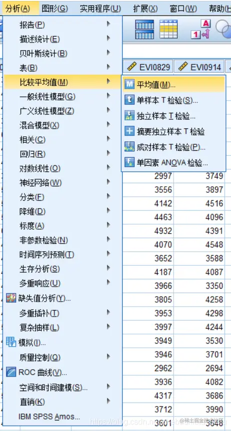 随后,选择“分析”,并在“比较平均值”中选择“平均值”。