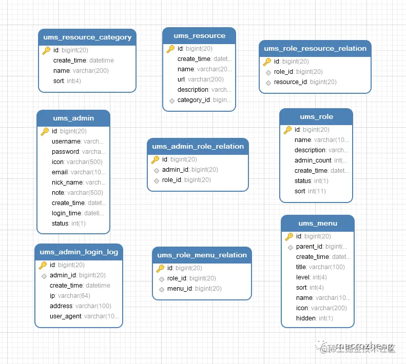 这里将以mall项目中权限管理模块相关表为例进行介绍,具体表结构如下。