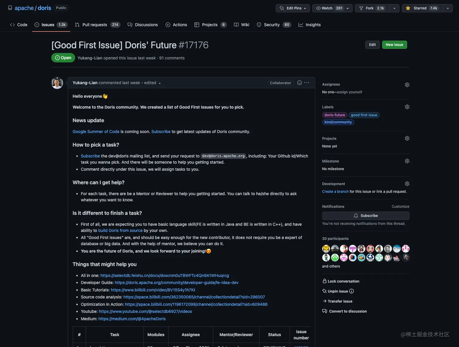 #17176 (github.com/apache/dori… 在 Apache Doris 社区是一个特殊的存在。跟大多开源社区相似的地方在于,这属于社区为了吸引更多新生力量参与而设置的 Good First Issue。不同的地方在于,新生力量对于参与开发任务的热情超乎想象,每一批新任务的公开就如同春运期间火车票的发售——可能迟了一小会儿,就与心仪的任务擦肩而过。