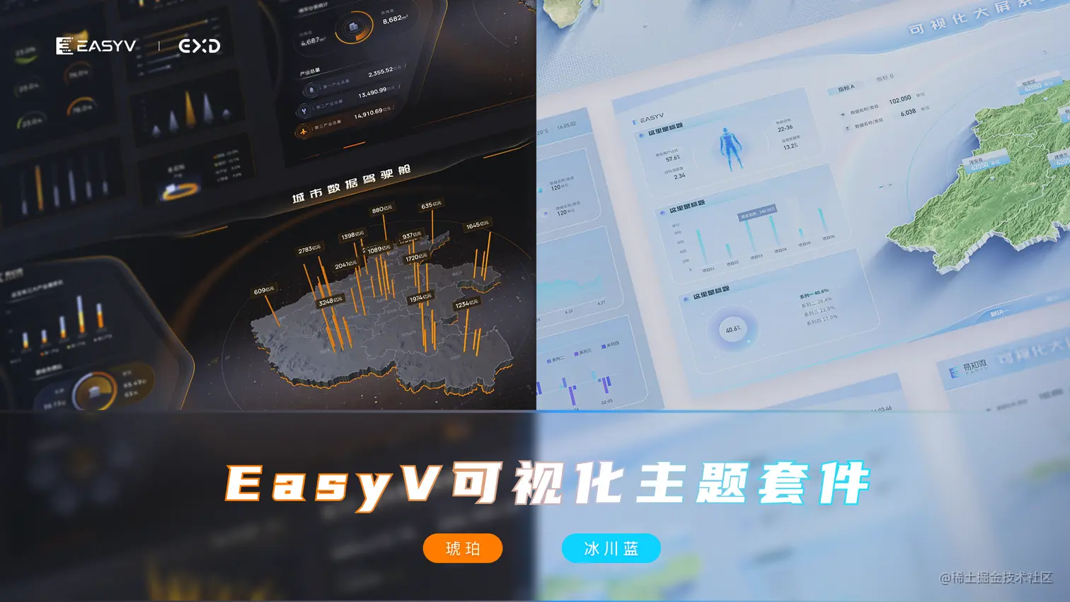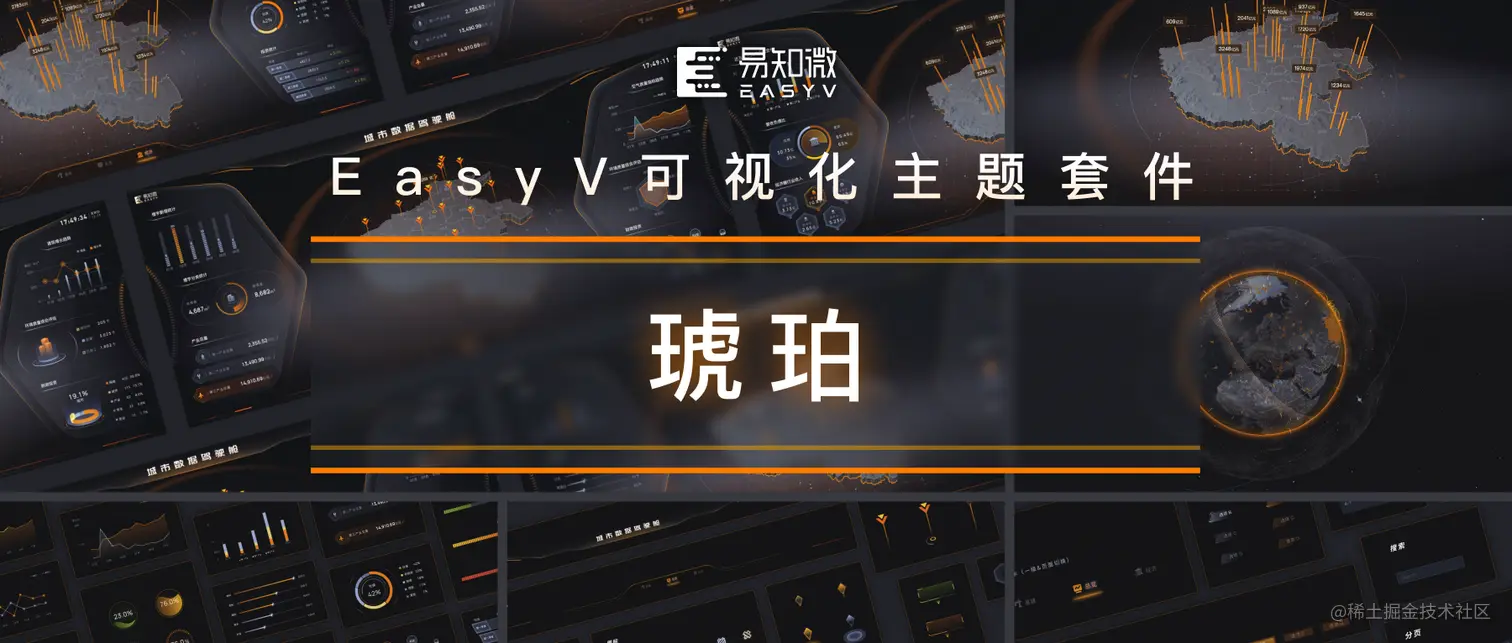 让你的数据“活”起来,可视化设计套件分享 易知微EasyV数字孪生可视化 2023-03-10 60 阅读1分钟 奔着每位用户能够低成本、高质量、更快捷地搭建可视化大屏应用的统一目标,易知微可视化设计团队结合自身宝贵的可视化项目经验,推出可视化资源套件,本期上线主题——「琥珀」&「冰川蓝」** 该套资源主题目前已覆盖颜色库、交互组件库、文字库、地图库、图表库、装饰库、框架库、主视觉库等等各大类型库,轻松调用风格样式一致的各类组件,致力于高效高质设计搭建可视化大屏! ** 下拉查看作品详情👇 easyv.cloud/market?t=juejin