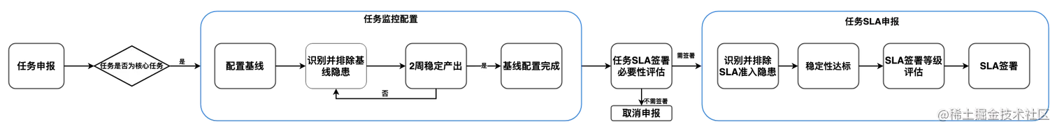 首先,数据研发团队根据业务需求,圈定出需要被 SLA 保障的核心任务,包括线上核心任务、管理驾驶舱数据以及周报、月报等重点业务核心看板。
