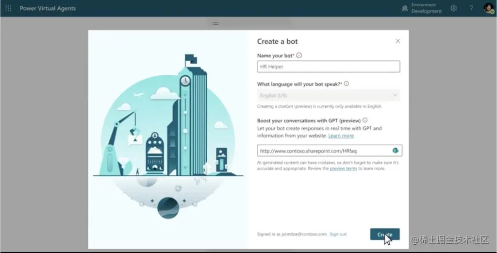 只要你将 AI 聊天机器人指向企业的特定资源,如网站或者知识库,然后如下图点击创建,进行配置,然后向机器人提问,就可以收到回答,该功能开箱即用,无须额外编写代码。