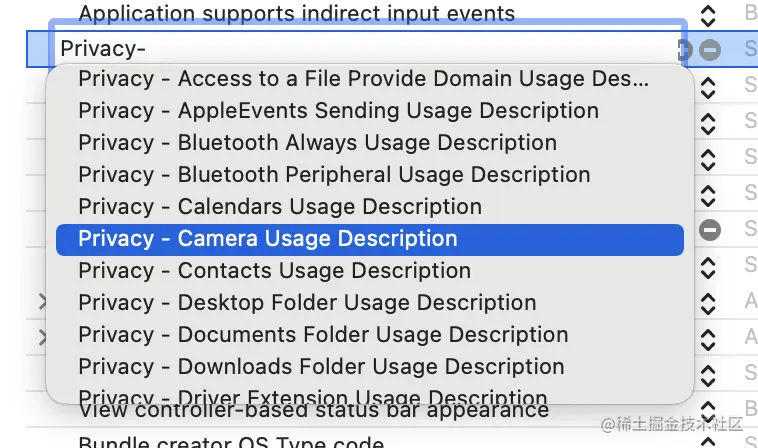 iOS 和 macOS 可以直接在 Info.plist 文件添加 NSCameraUsageDescription 和 NSCameraUsageDescription 的权限声明,或者在 Xcode 的 Info 栏目添加 Privacy - Microphone Usage Description 和 Privacy - Camera Usage Description。