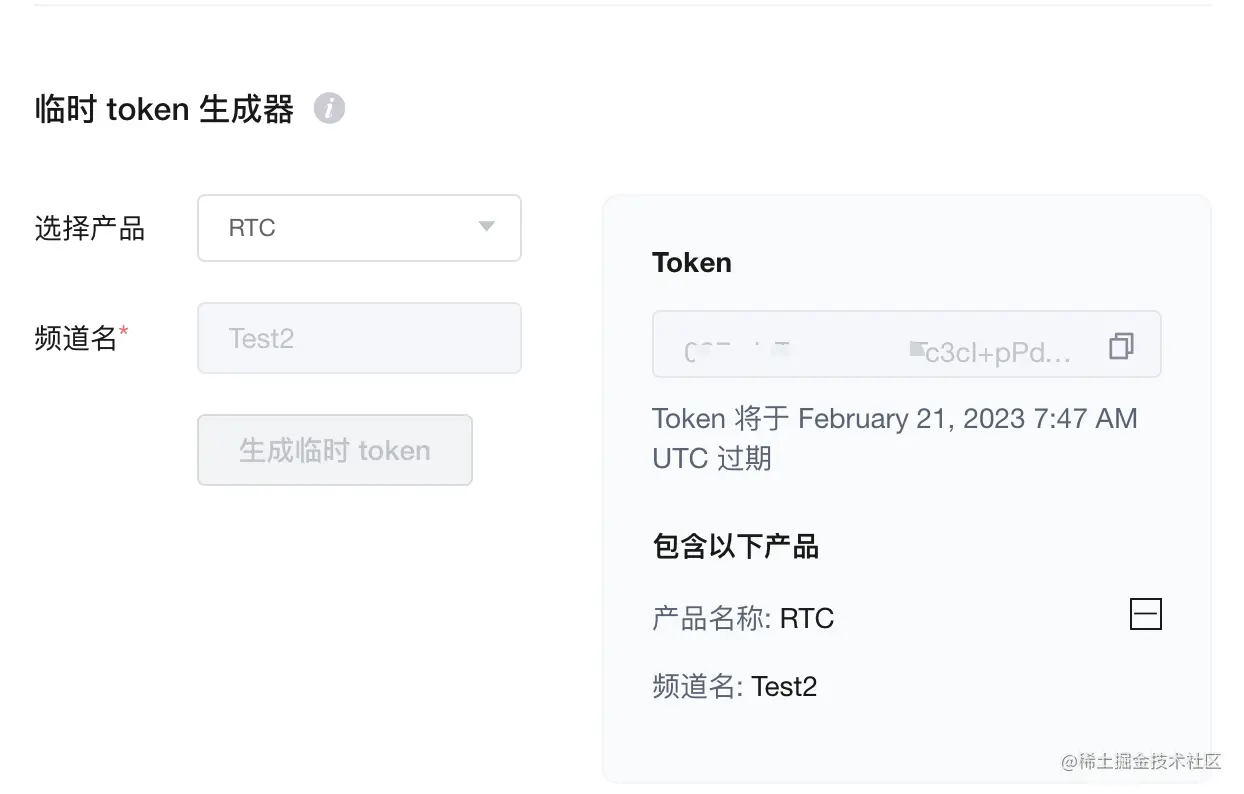 在频道名输入一个临时频道,比如 Test2 ,然后点击生成临时 token 按键,即可获取一个临时 Token,有效期为 24 小时。