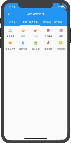 先来看一个简单的例子,它使用到 GridView.count 构造函数模仿美团外卖首页服务列表(服务菜单项的代码可以看这里,也算是对基础组件使用的进一步巩固):