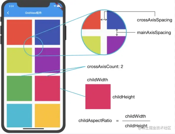- crossAxisSpacing :次轴方向上的空隙间距;