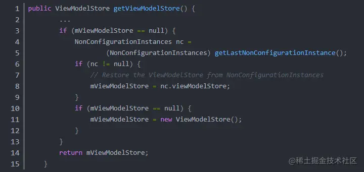 可以看大mViewModelStore变量如果是null的话,会从NonConfigurationInstances实例中取实例。