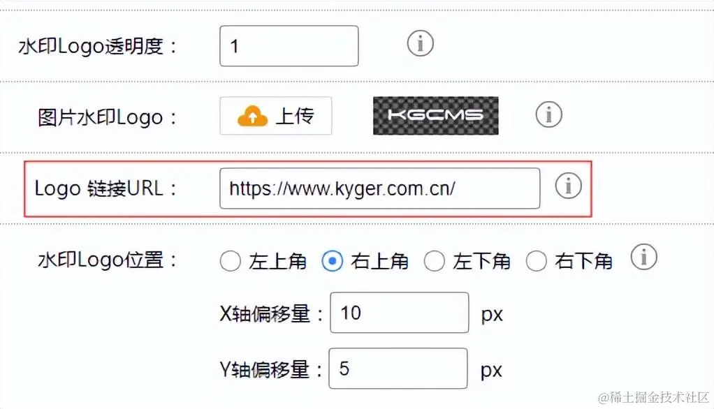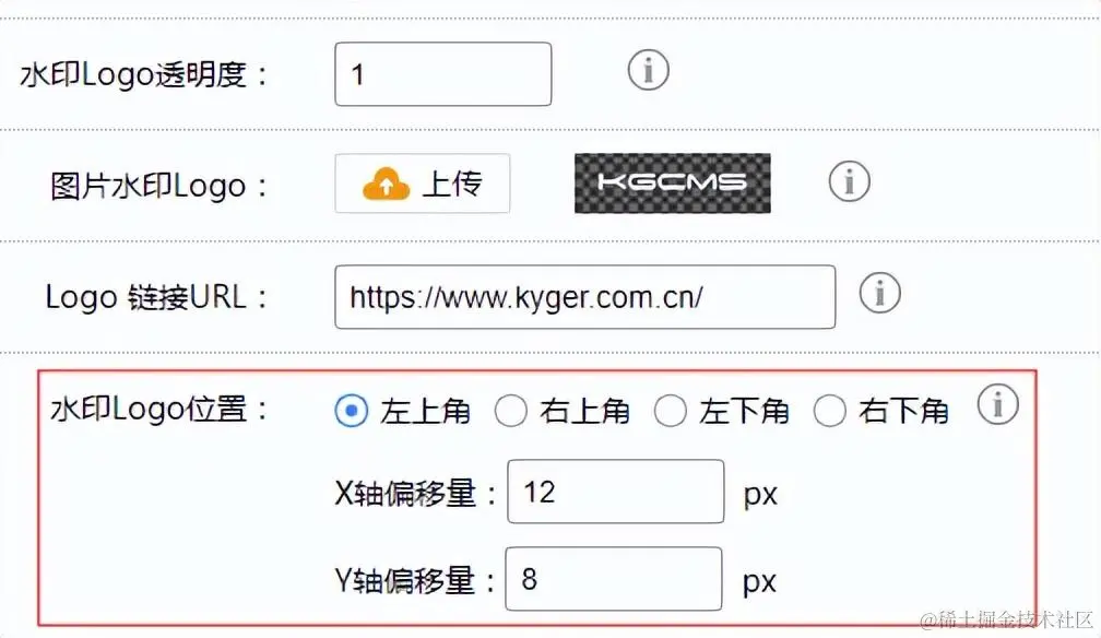 设置水印Logo位置,可选择左上/右上/左下/右下,并填写偏移值。