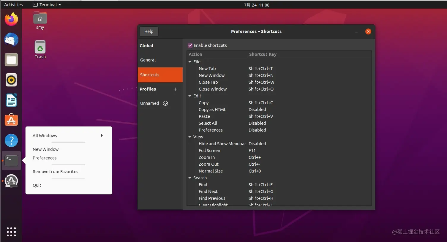 等所有文件安装完成后,重启虚拟机就可以正常使用Ubuntu了,初次进入时会提示你登录Ubuntu账号或者Google账号,这些均可以跳过,直接来到Ubuntu桌面即可,调出命令行窗口,可右击选择Preferences查看Ubuntu命令行窗口的快捷键,这将大大提高的你的工作效率!可以看到该Ubuntu版本是带有图形界面的,在后面的区块链浏览器开发中会使用到,但是其他项目几乎都用不到,如果你的内存有限,可以关闭图形界面,使用单命令行模式进行操作。(推荐使用Xshell软件与虚拟机建立ssh远程连接)