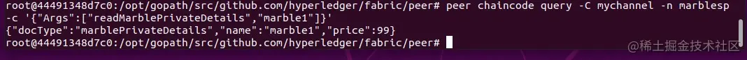 第二个 query 命令调用传递了 collectionMarblePrivateDetails 作为参数 的 readMarblePrivateDetails 函数。