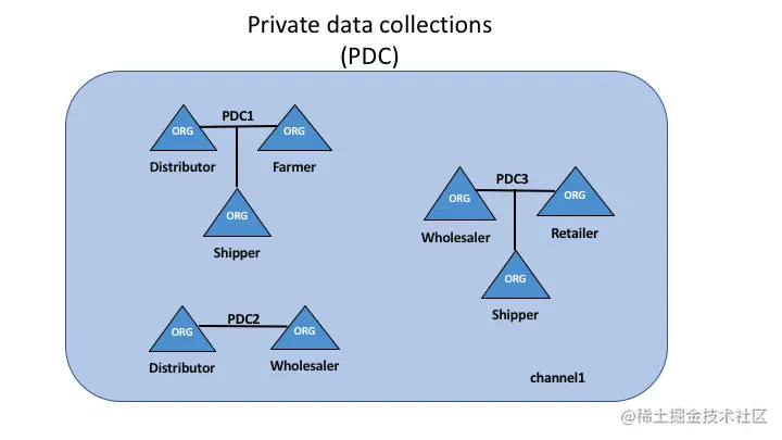 与其为这些私有数据关系定义许多小通道,不如定义多个私有数据集合(PDC)在以下各方之间共享私有数据:
