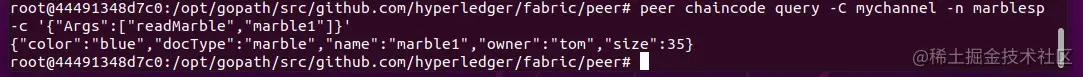 peer chaincode query -C mychannel -n marblesp -c '{"Args":["readMarble","marble1"]}'
