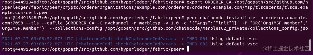 export ORDERER_CA=/opt/gopath/src/github.com/hyperledger/fabric/peer/crypto/ordererOrganizations/example.com/orderers/orderer.example.com/msp/tlscacerts/tlsca.example.com-cert.pem peer chaincode instantiate -o orderer.example.com:7050 --tls --cafile $ORDERER_CA -C mychannel -n marblesp -v 1.0 -c '{"Args":["init"]}' -P "OR('Org1MSP.member','Org2MSP.member')" --collections-config /opt/gopath/src/github.com/chaincode/marbles02_private/collections_config.json