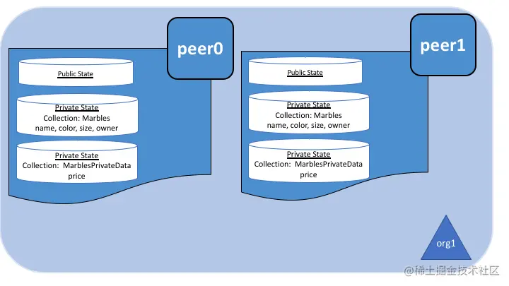我们收集器的定义允许 Org1 和 Org2 的所有成员在他们的侧数据库中使用 name, color, size, owner 私有数据,但是只有 Org1 的节点可以在他们的侧数据库中保存 price 私有数据。作为一个 Org1 中的授权节点,我们将查询两个私有数据集合。