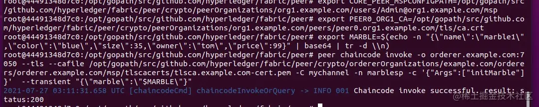 2021-07-27 03:24:07.724 UTC [chaincodeCmd] chaincodeInvokeOrQuery -> INFO 001 Chaincode invoke successful. result: status:200