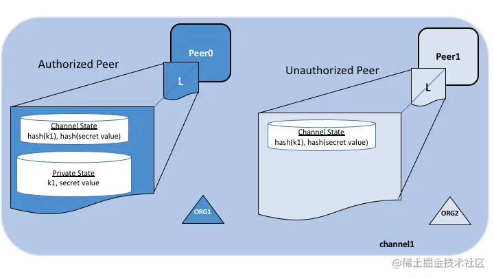 下图说明了一个被授权拥有私有数据的节点和一个未授权的节点的账本内容。