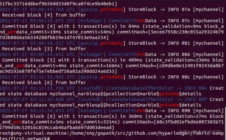 2021-07-27 03:20:45.422 UTC [kvledger] CommitWithPvtData -> INFO 09f [mychannel] Committed block [7] with 1 transaction(s) in 278ms (state_validation=24ms block_and_pvtdata_commit=14ms state_commit=237ms) commitHash=[a023aca1ae8764da787b8a118ac410c18920741fd044c9ef31f3ff64e983ff5c]