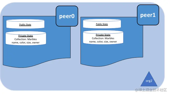 Org2 的节点在它们的数据库中有弹珠私有数据的第一个集合 ( name, color, size and owner ) 并且有权限使用 readMarble() 函数和 collectionMarbles 参数访问它。
